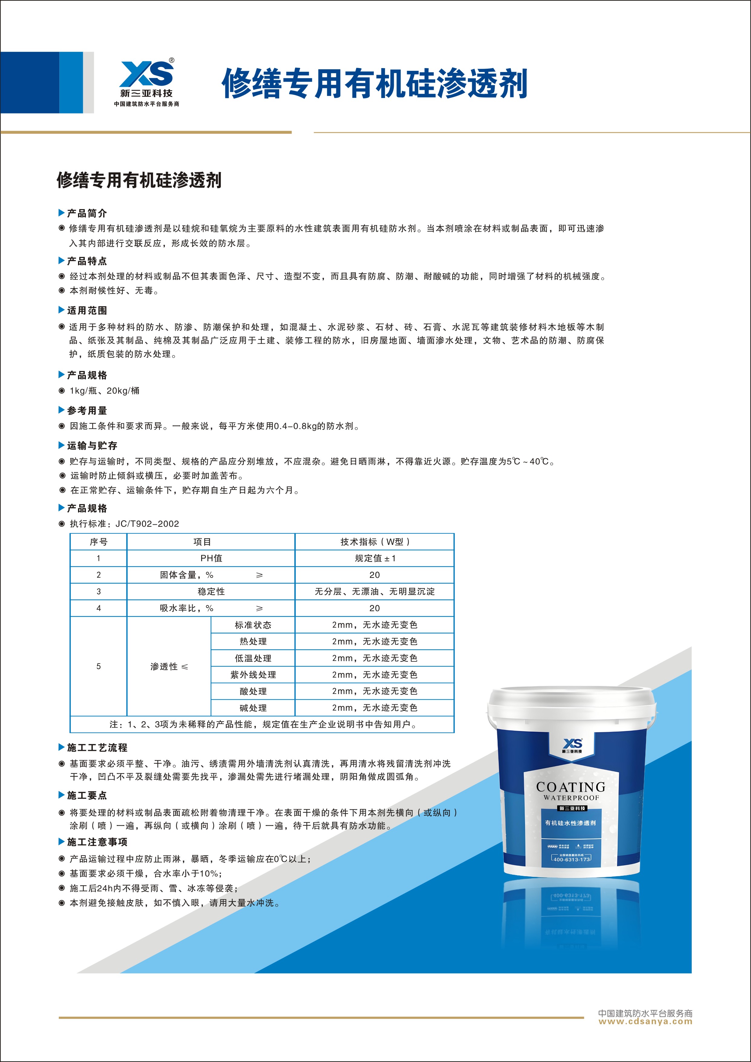 產(chǎn)品簡介: 修繕專用有機硅滲透劑是以硅烷和硅氧烷為主要原料的水性建筑表面用有機硅防水劑。當本劑噴涂在材料或制品表面,即可迅速滲入其內(nèi)部進行交聯(lián)反應,形成長效的防水層。 規(guī)格:5kg/桶